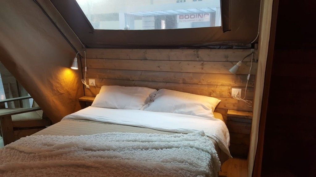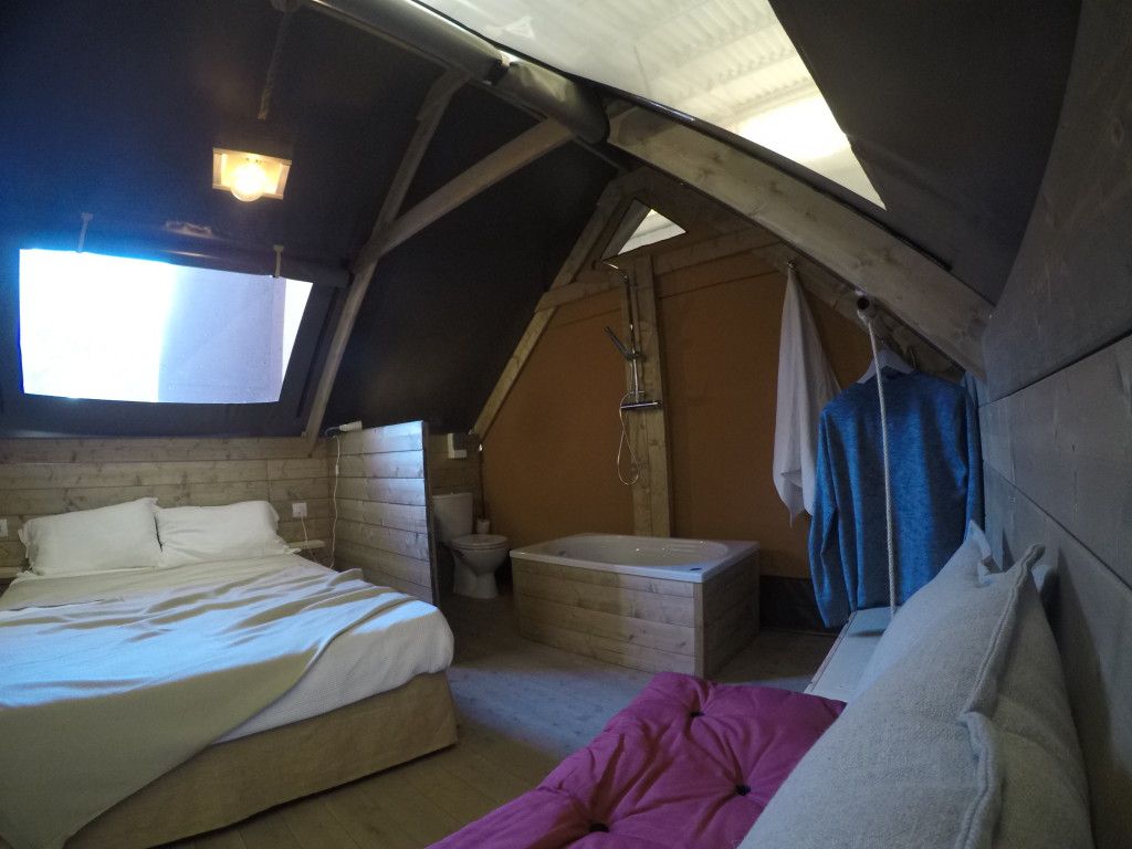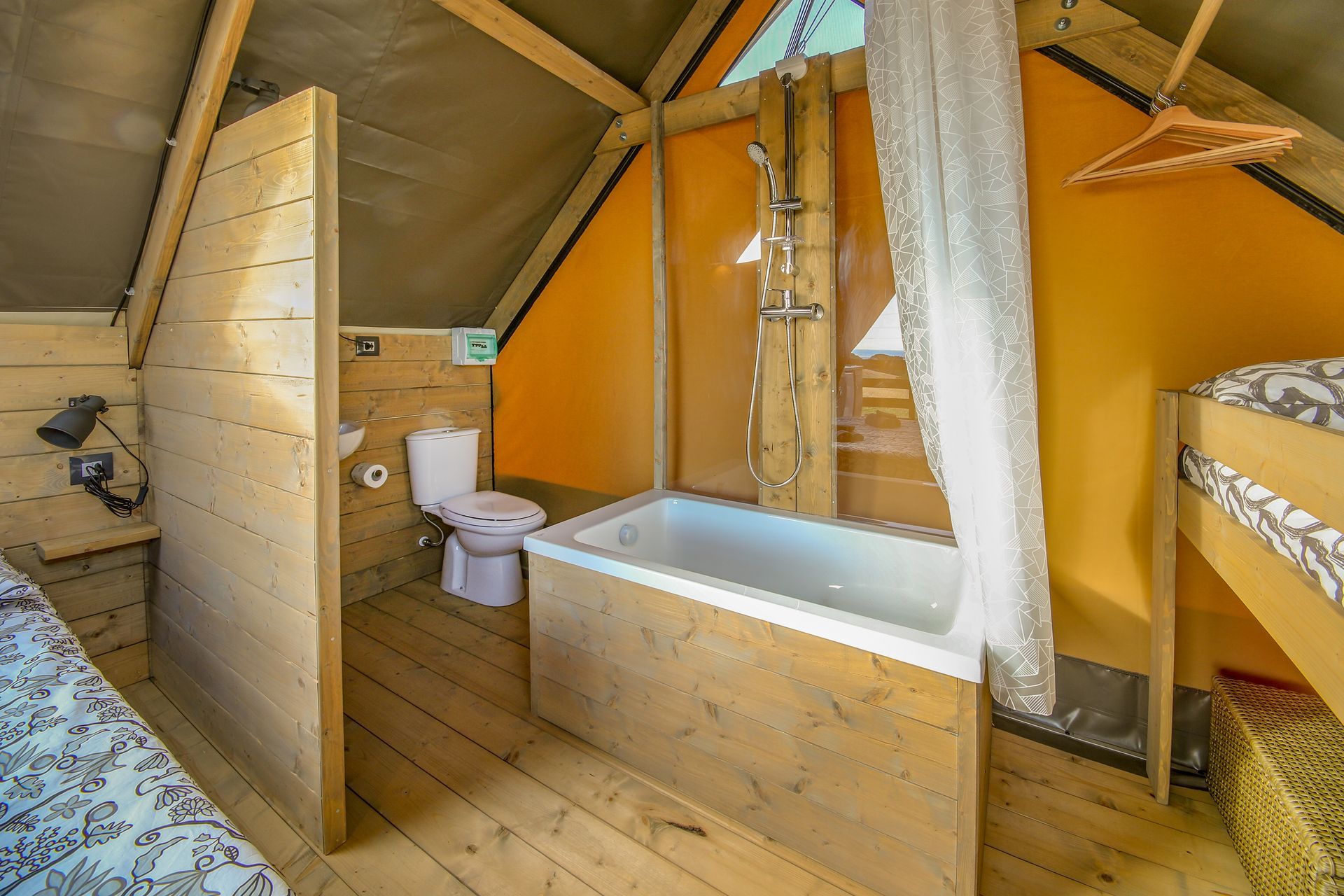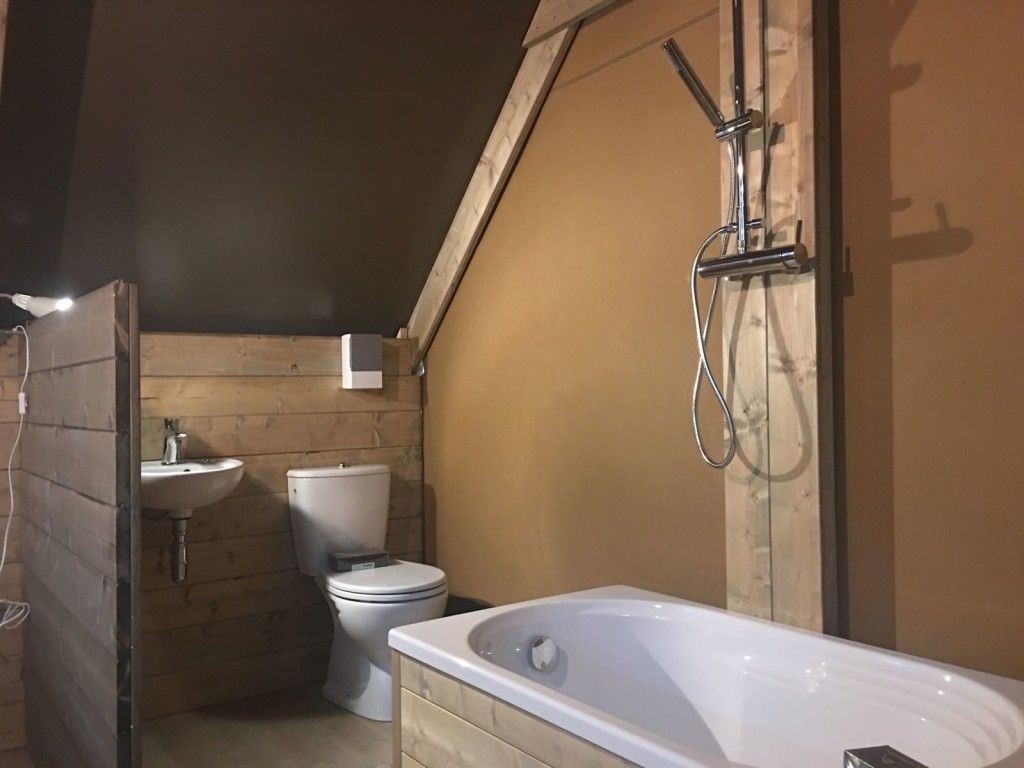 - Compy bathroom complete with washbasin, toilet, 70×120 wood-panelled bathtub with double nappa spout and ray curtain, 15/30 litre storage tank.