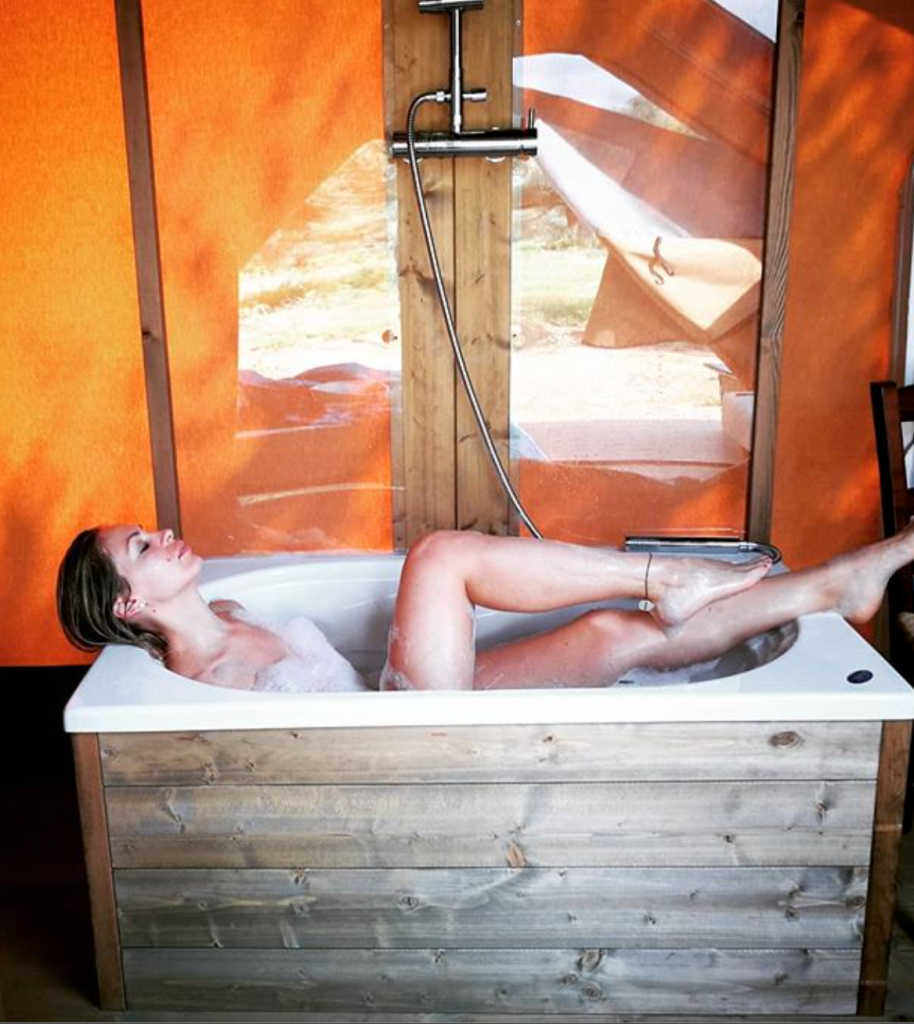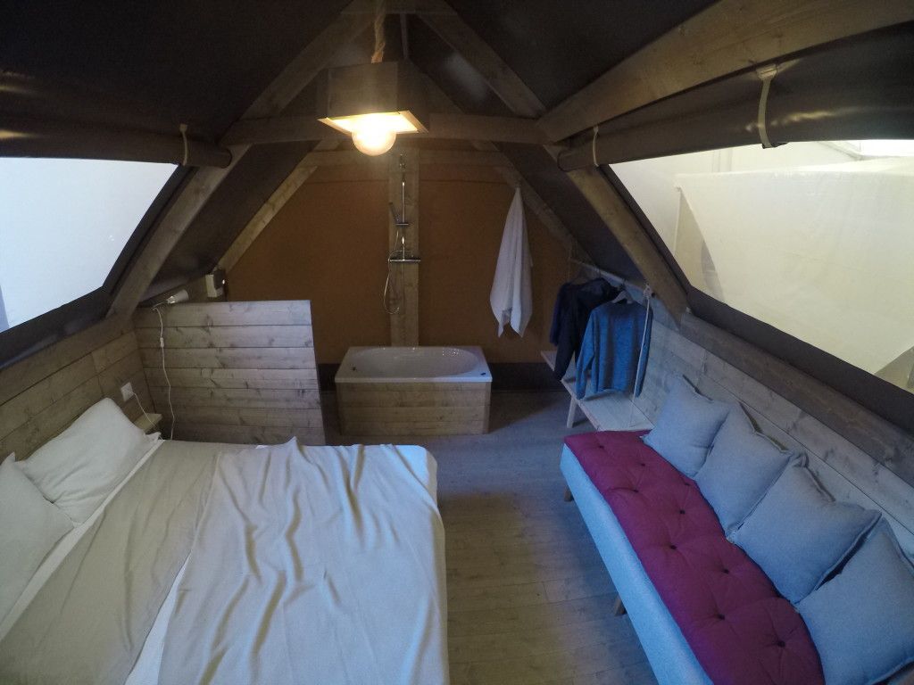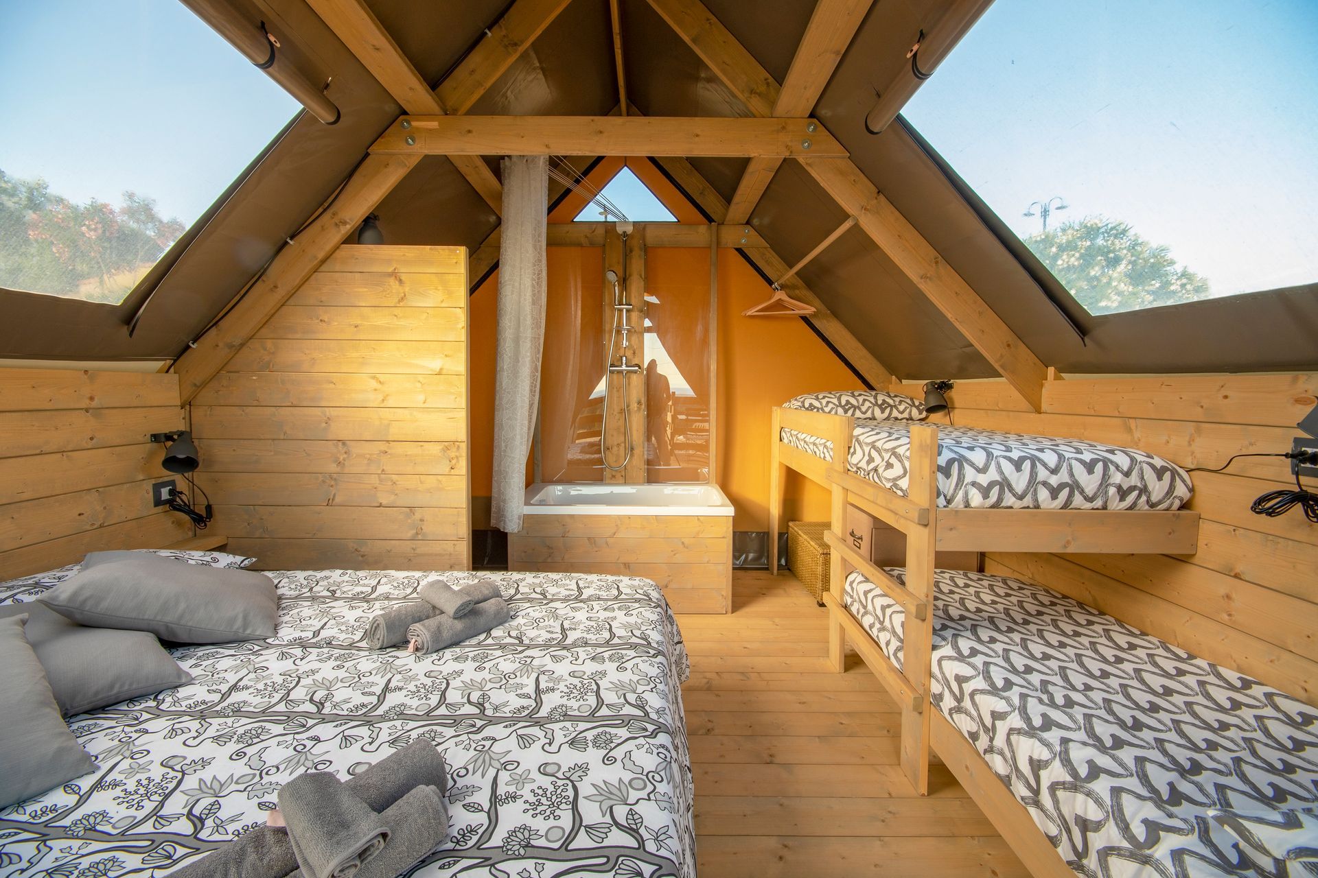 - Compy bathroom complete with washbasin, toilet, 70×120 wood-panelled bathtub with double nappa spout and ray curtain, 15/30 litre storage tank.