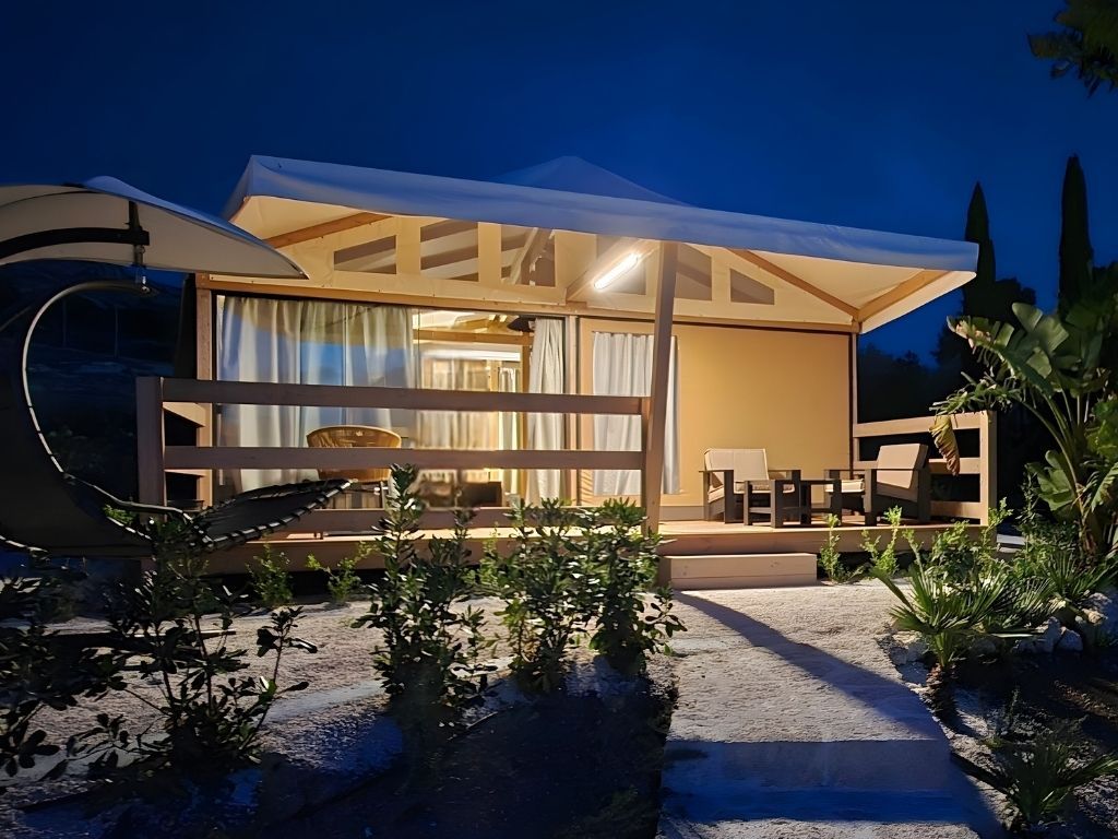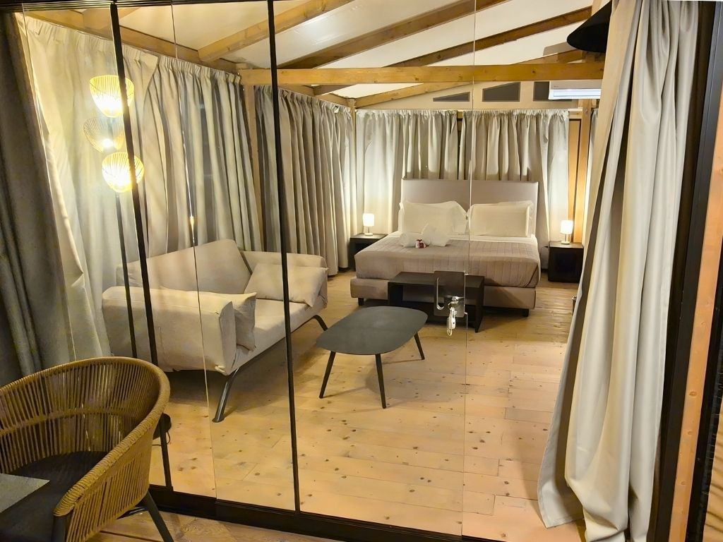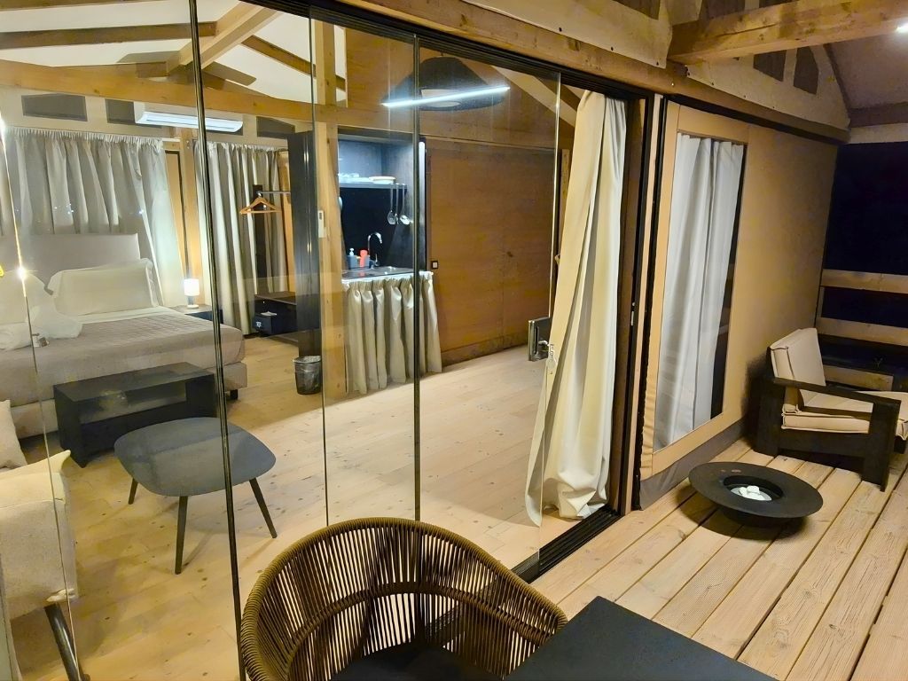 - Pareti interne in perlina d’abete o nobilitato, pareti esterne in STAM certificato ignifugo o policotone, finestre ed aperture scorrevoli in Cristal 500.