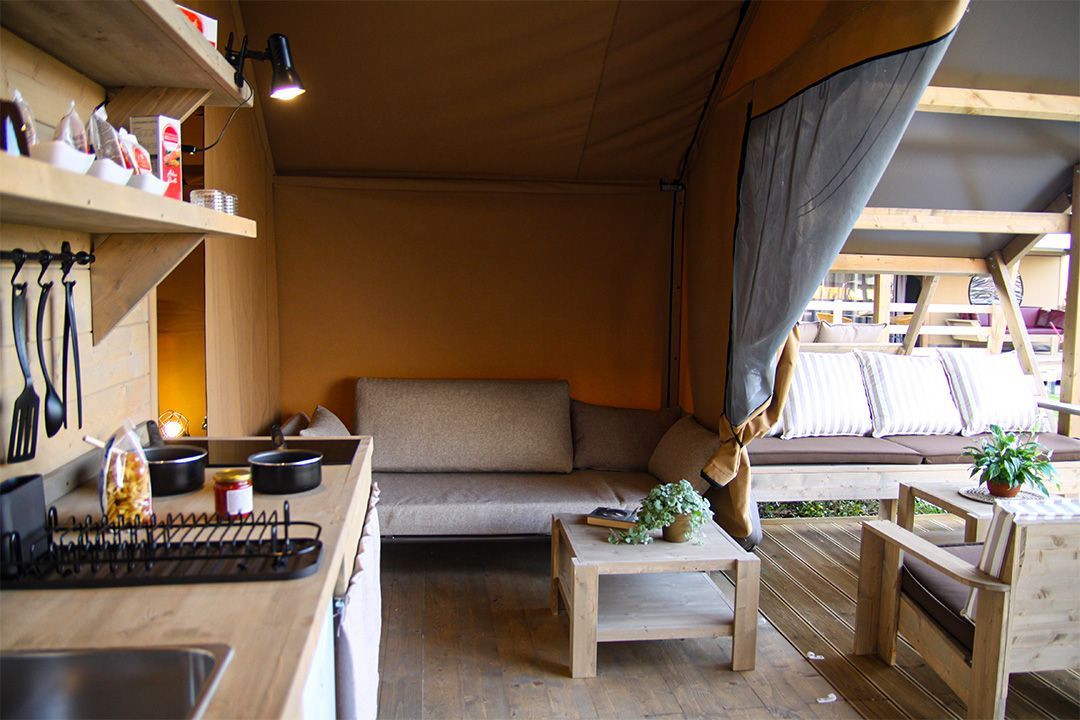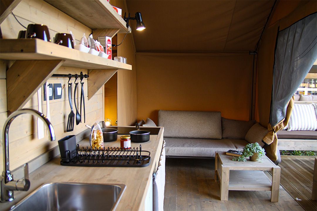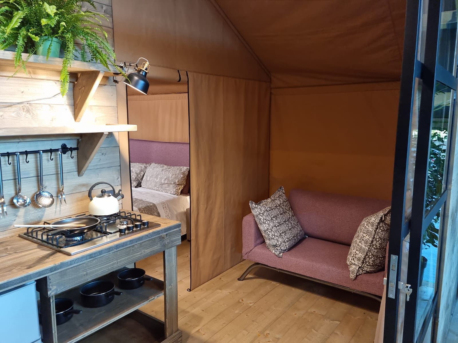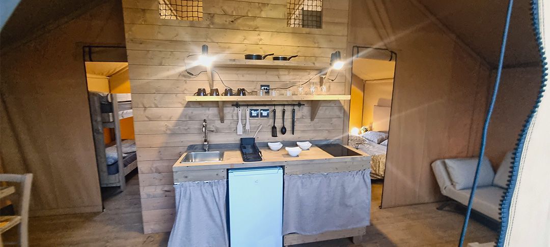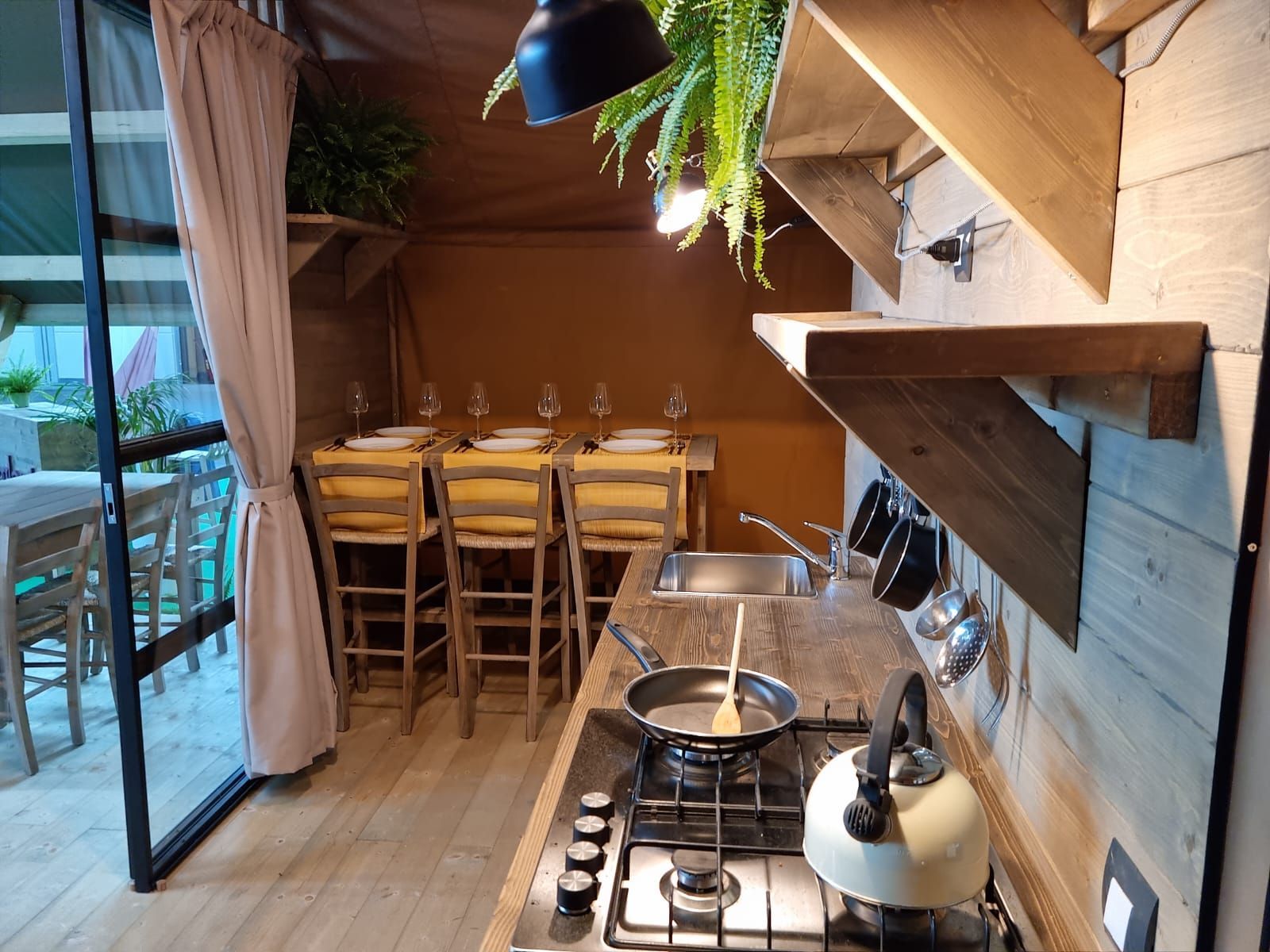 - Cucina in legno completa di piano cottura, frigo sottopiano, pensile, lavello in acciaio inox e rubinetteria