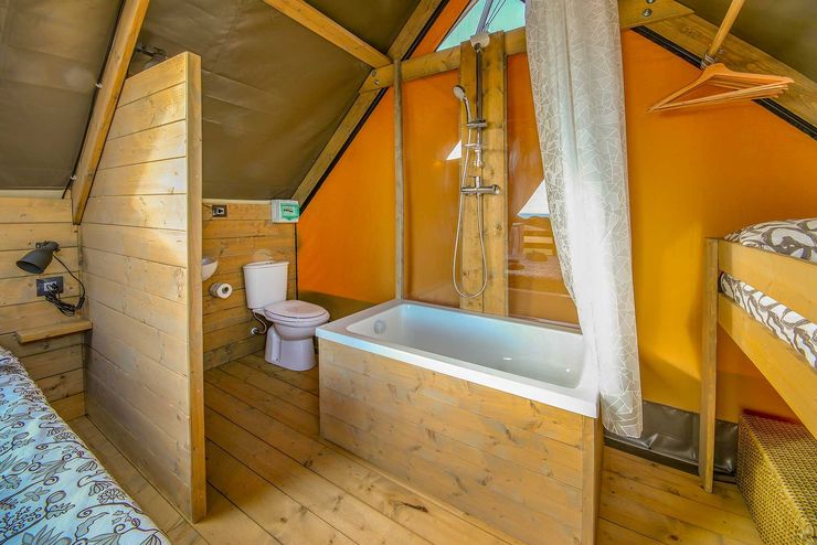Prefabriccato, rimovibile, riposizionabile, impianto elettrico e impianto idraluico certificati installati a bordo del Modulo. Coperto da brevetto di utilizzo, rappresenta un vantaggio nell'installazione e nel ottenimento dei permessi, inseribile e rimovibile all'interno delle tende, con necessità solo di attacco alla rete idrica o fognaria.